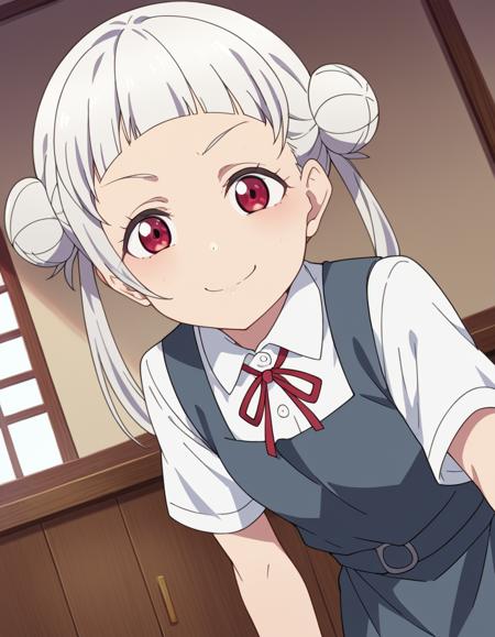 Activation keywords: <lora:chisato-arashi-s2-ponyxl-lora-nochekaiser:1>, chisato arashi, long hair, bangs, red eyes, twintails, white hair, blunt bangs, hair bun, double bun, and shirt, dress, ribbon, school uniform, white shirt, short sleeves, collared shirt, red ribbon, neck ribbon, pinafore dress, grey dress, summer uniform, yuigaoka school uniform,